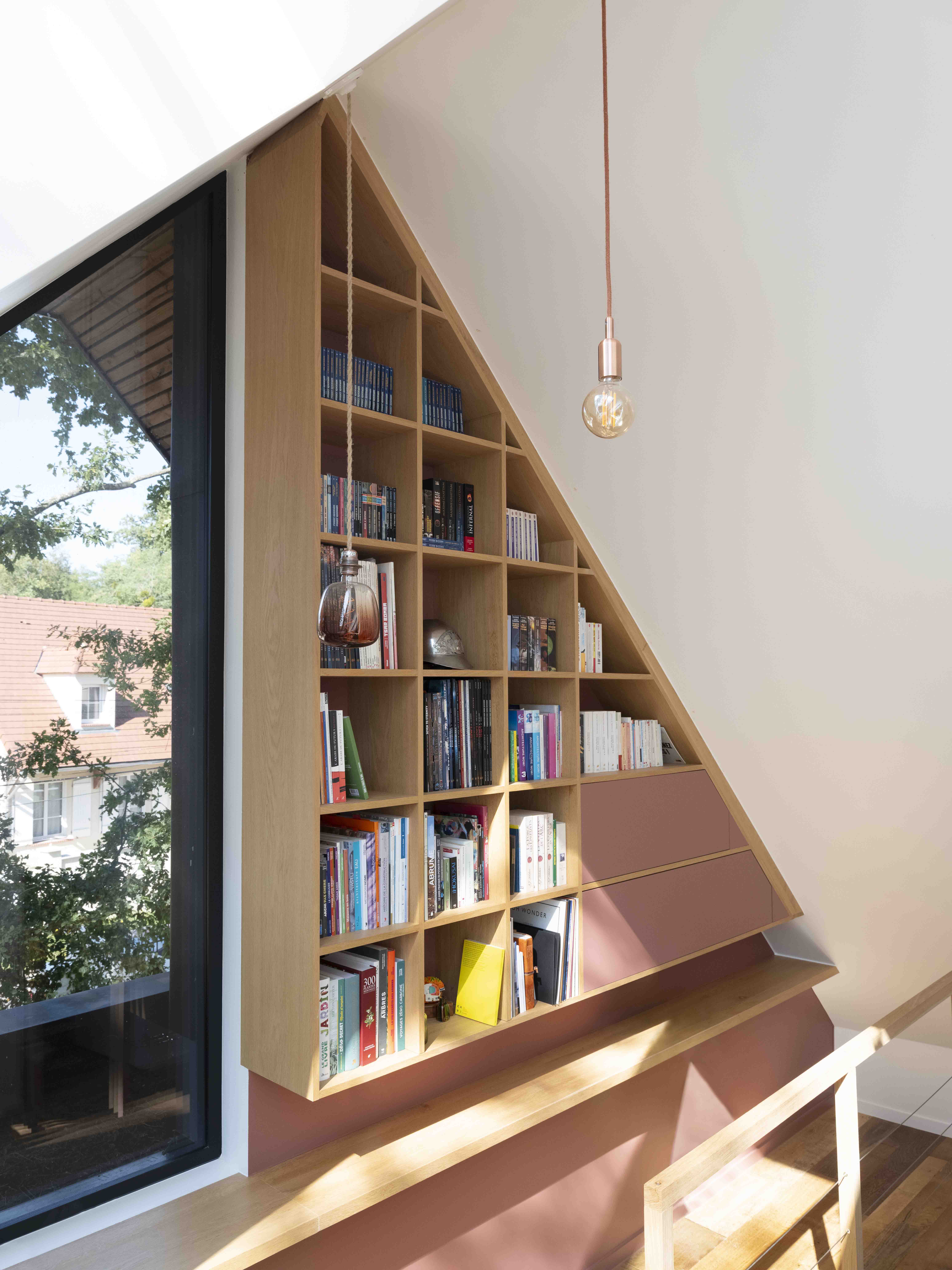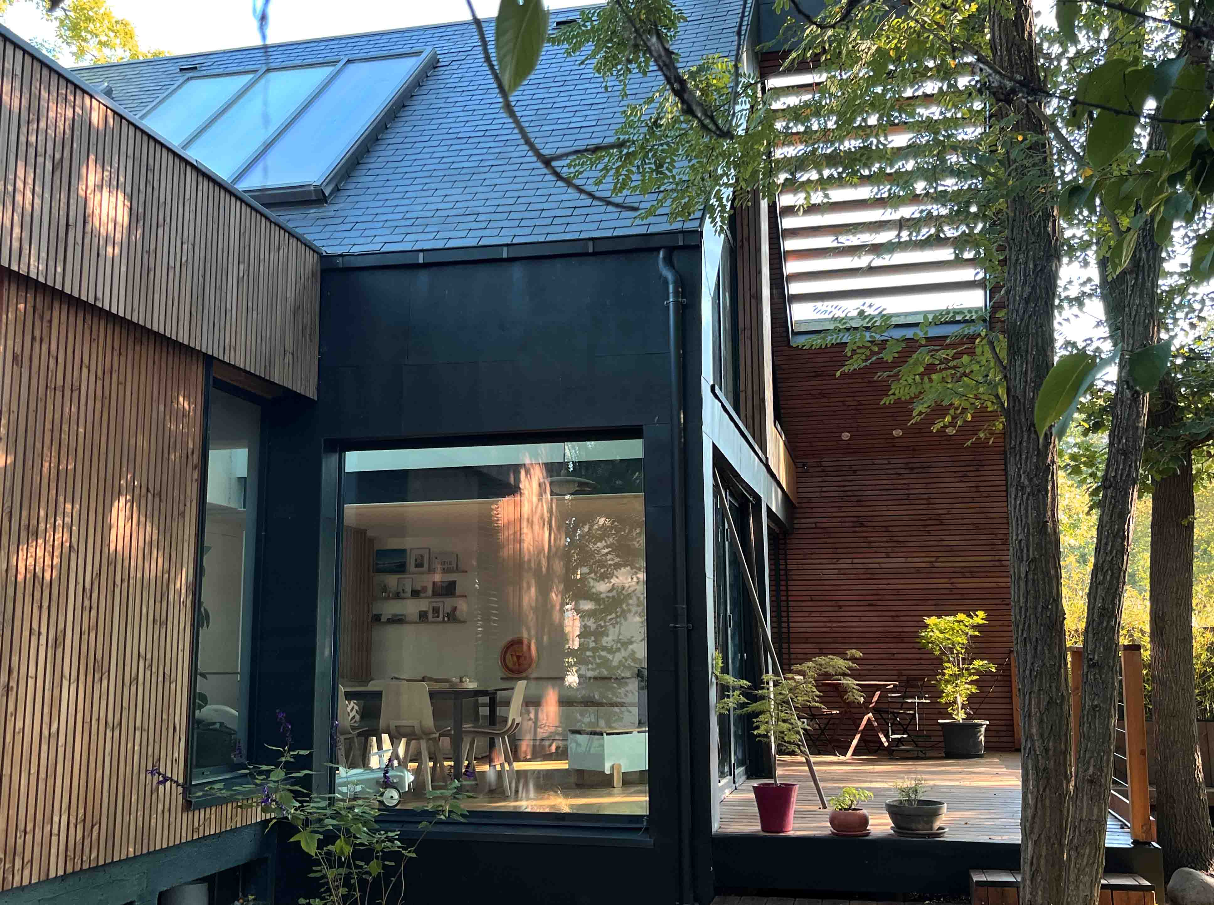 Création d'une maison bioclimatique / passive en ossature bois au milieu des arbres. Recherche d'un haut niveau de performance énergétique en privilégiant la qualité du bâti et le faible impact environnemental. La maison se compose de deux volumes sur pilotis. Ainsi les eaux pluviales peuvent continuer de s’infiltrer sous l’emprise de la maison. Les toitures plates sont végétalisées. Les ouvertures, principalement au Sud, en triple vitrage sont aussi orientées vers la forêt. Elles contribuent au chauffage de la maison l'hiver et de favoriser l'éclairage naturel. Mur intérieur en enduit terre de finition. Bardage bois, terrasses bois, isolation en laine de bois, récupération des eaux pluviales dans un bassin, toiture en ardoises, mise en place d'un ballon d'eau chaude solaire. Photos : 1 - 3 -8 à 11 - 15 et 24 : Sylvain DUFFARD